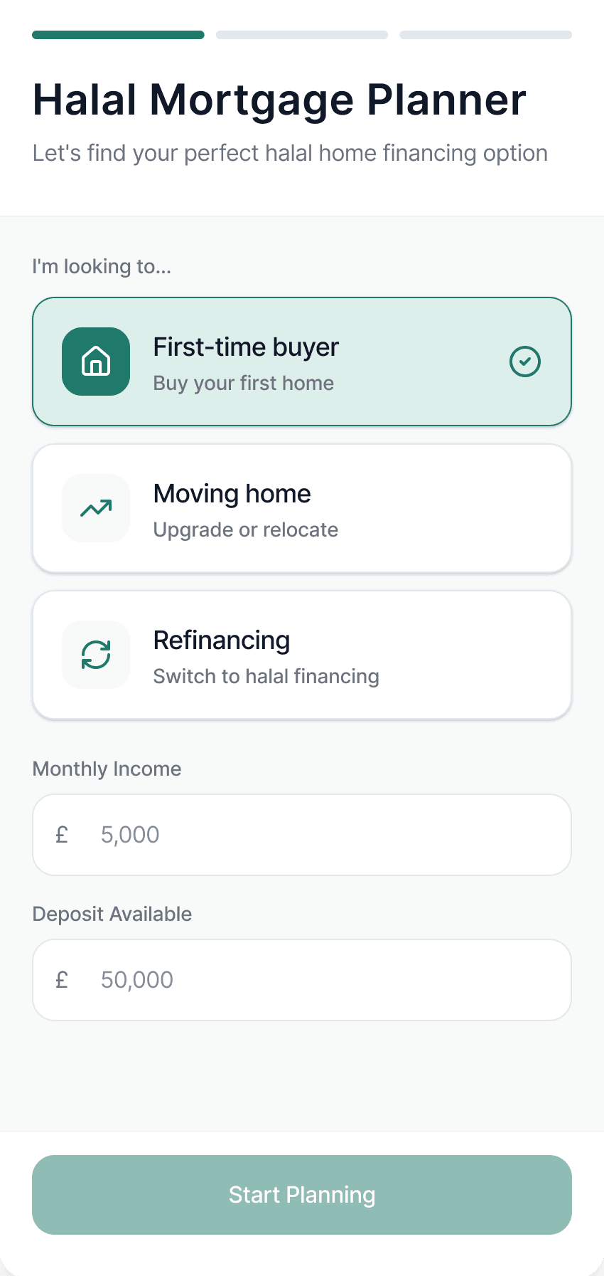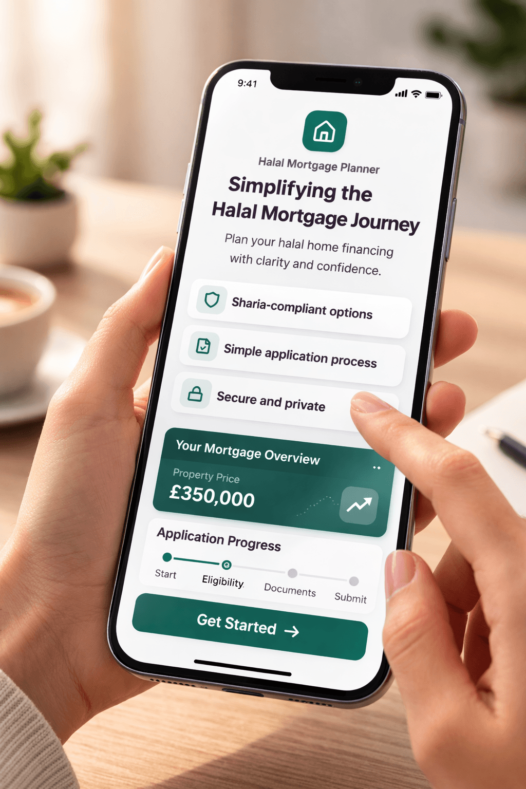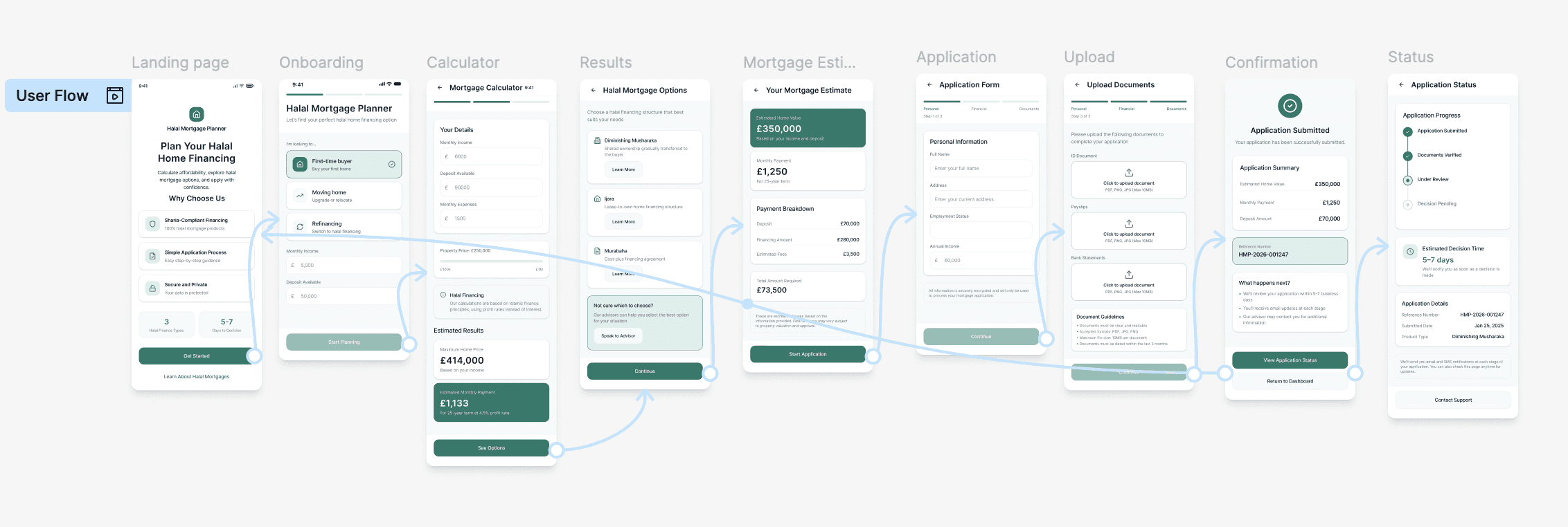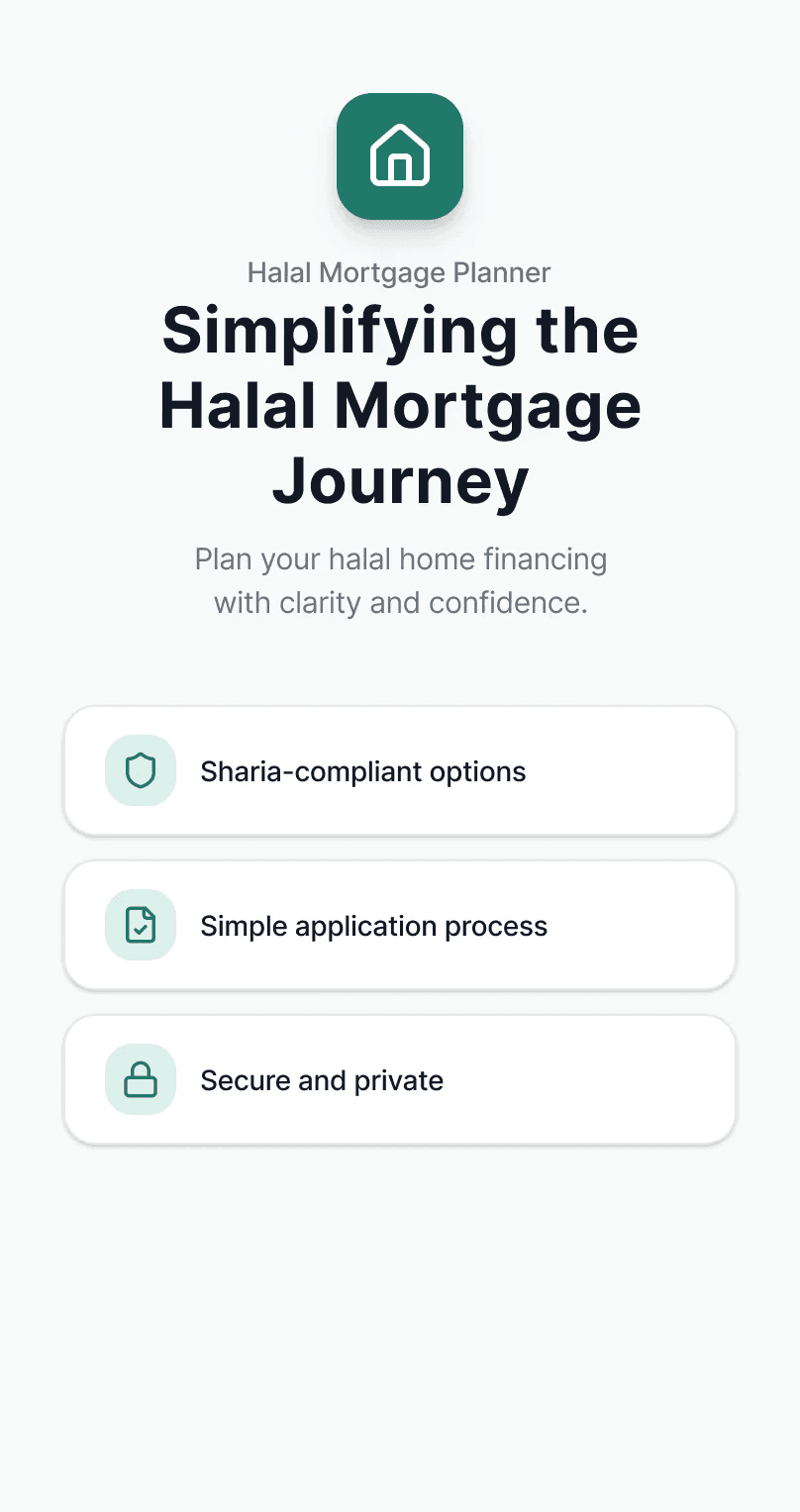 Halal Mortgage Planner is a mobile fintech concept designed to simplify the halal mortgage journey from planning to approval. The app helps users calculate affordability, explore Sharia-compliant financing options, and complete a guided mortgage application through a clear and intuitive experience.