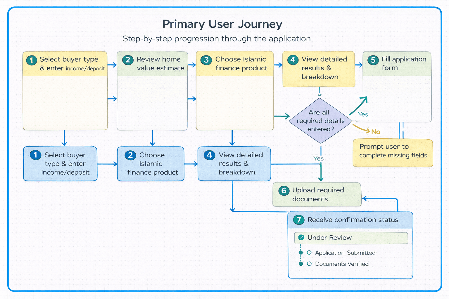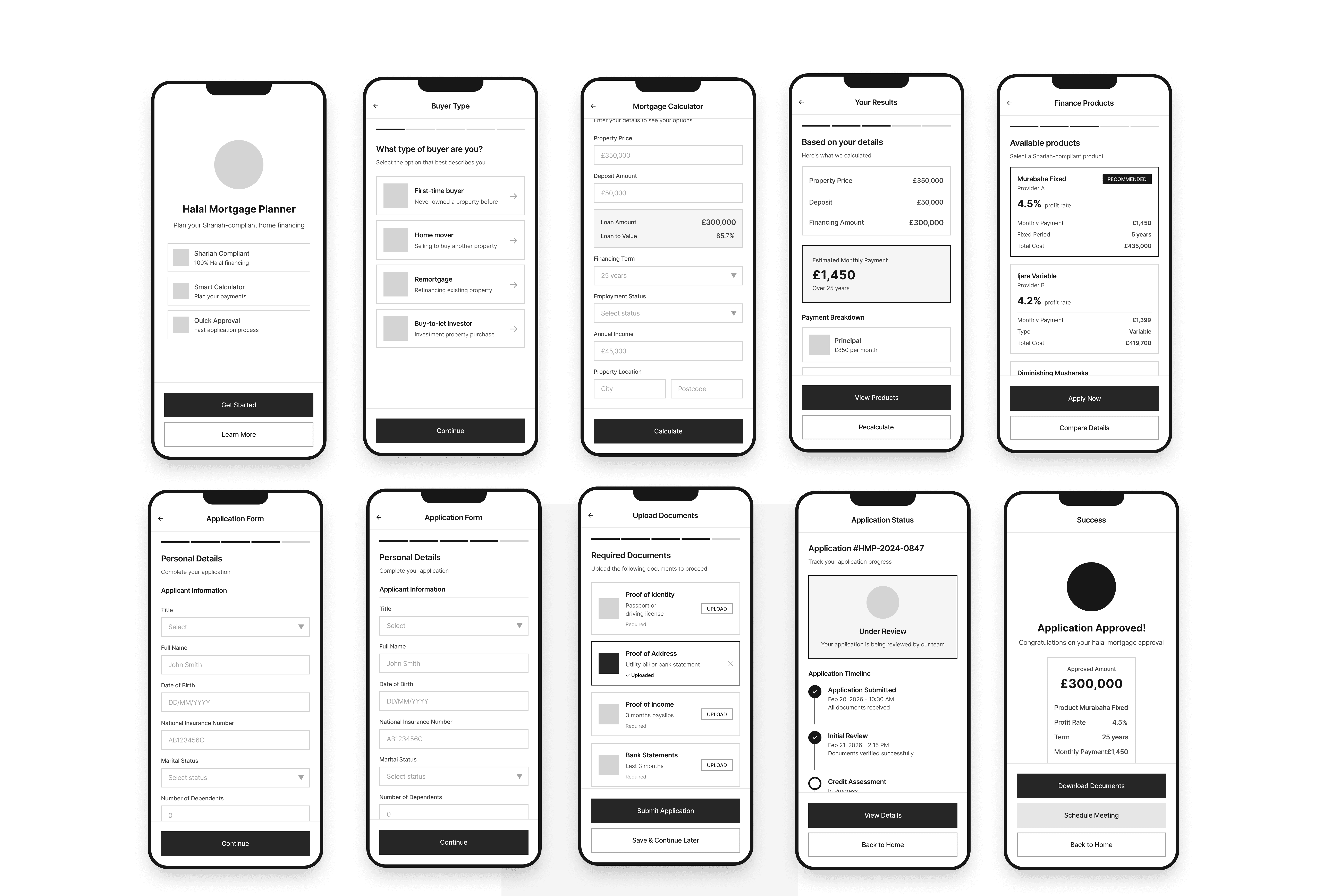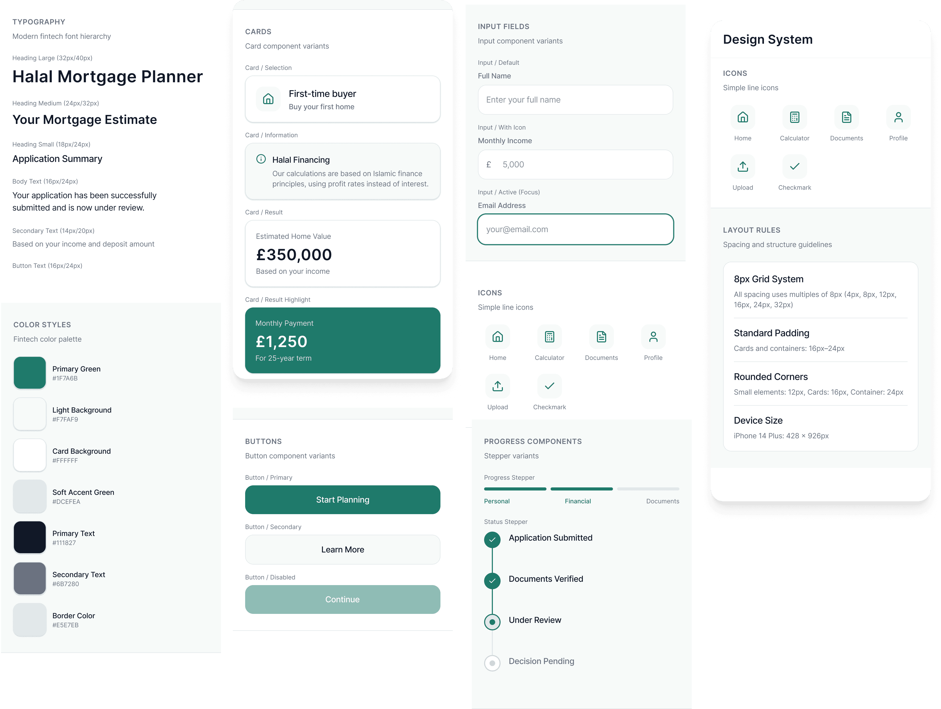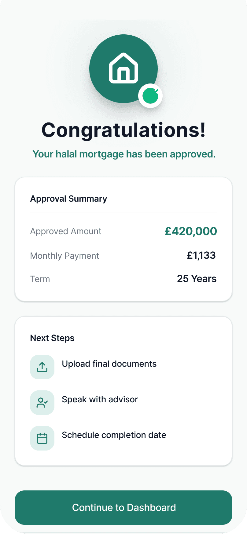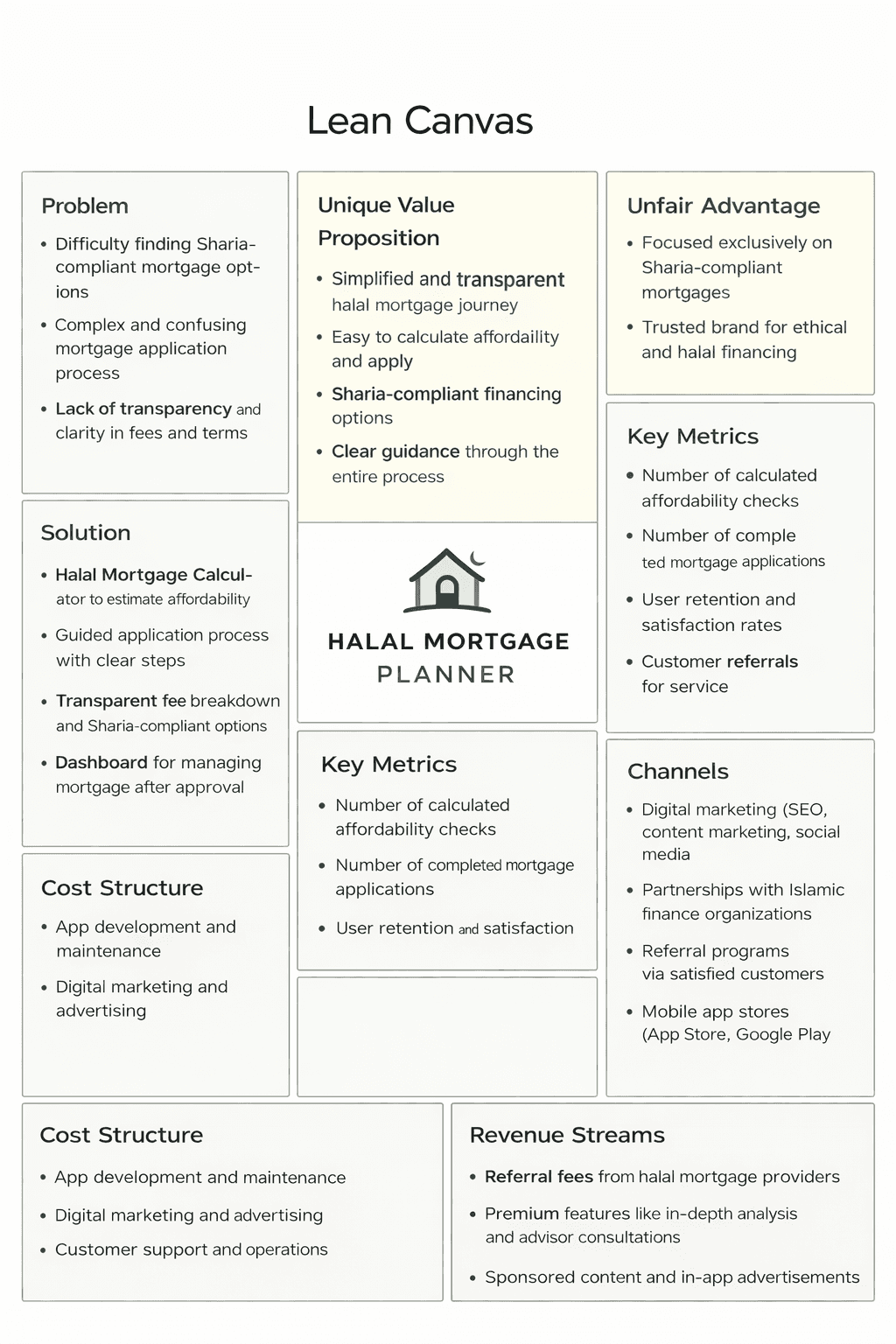 Halal Mortgage Planner is a mobile fintech concept designed to simplify the halal mortgage journey from planning to approval. The app helps users calculate affordability, explore Sharia-compliant financing options, and complete a guided mortgage application through a clear and intuitive experience.